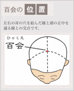 百会は頭のてっぺん、両耳と鼻の延長線が交わるところ。
