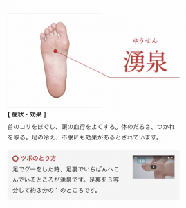 湧泉は足の裏、足でグーをしたときにいちばんへこむところ。
