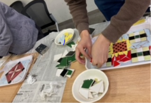 タイル職人さんに教えていただきながらトレーにタイルを貼り、装飾する体験をしました!