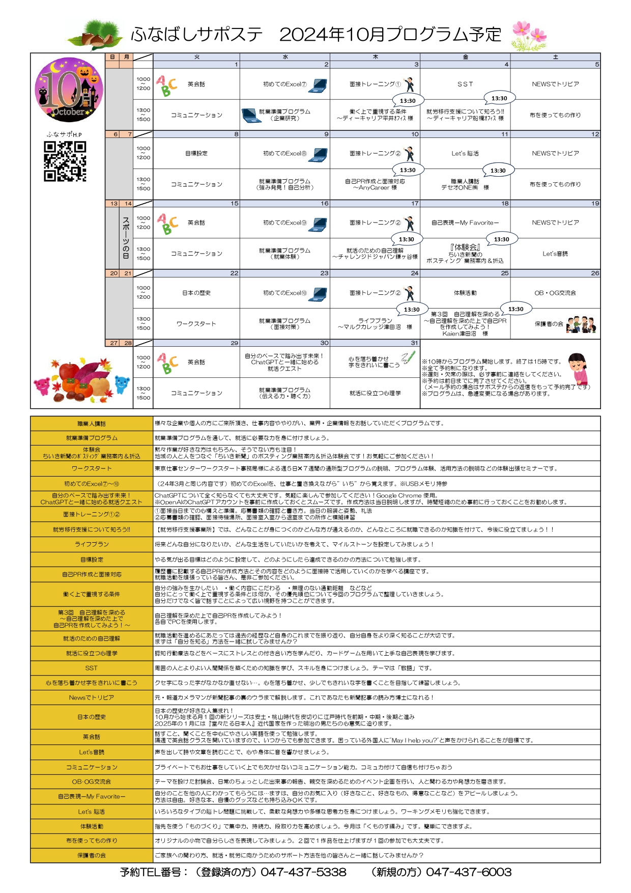 10月は今年度の折り返しスタート月になります。 今一度ご自身の「目的」「目標」を意識し、 サポステの面談やプログラムを有効に活用して今より少しでも進んでみましょう。 今月は実際のお仕事が体験できる『体験会』を行います […]