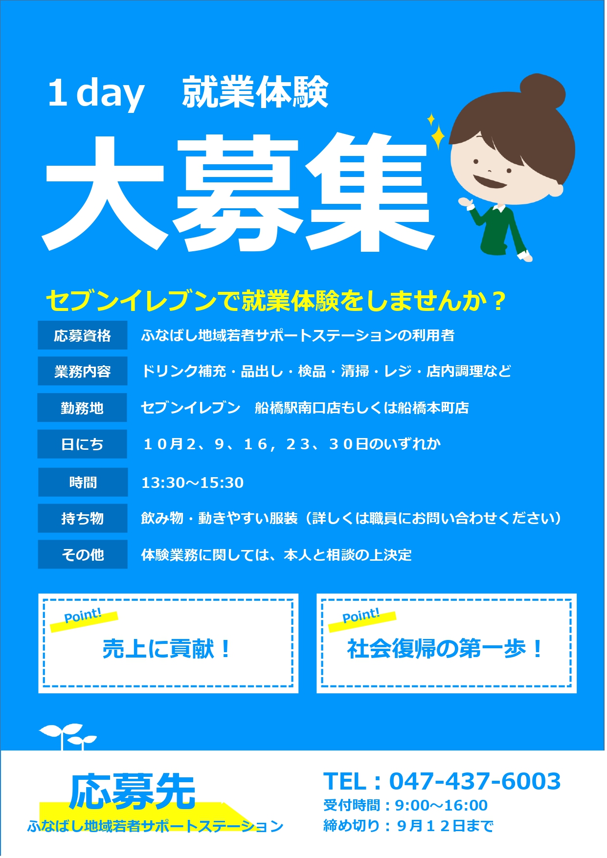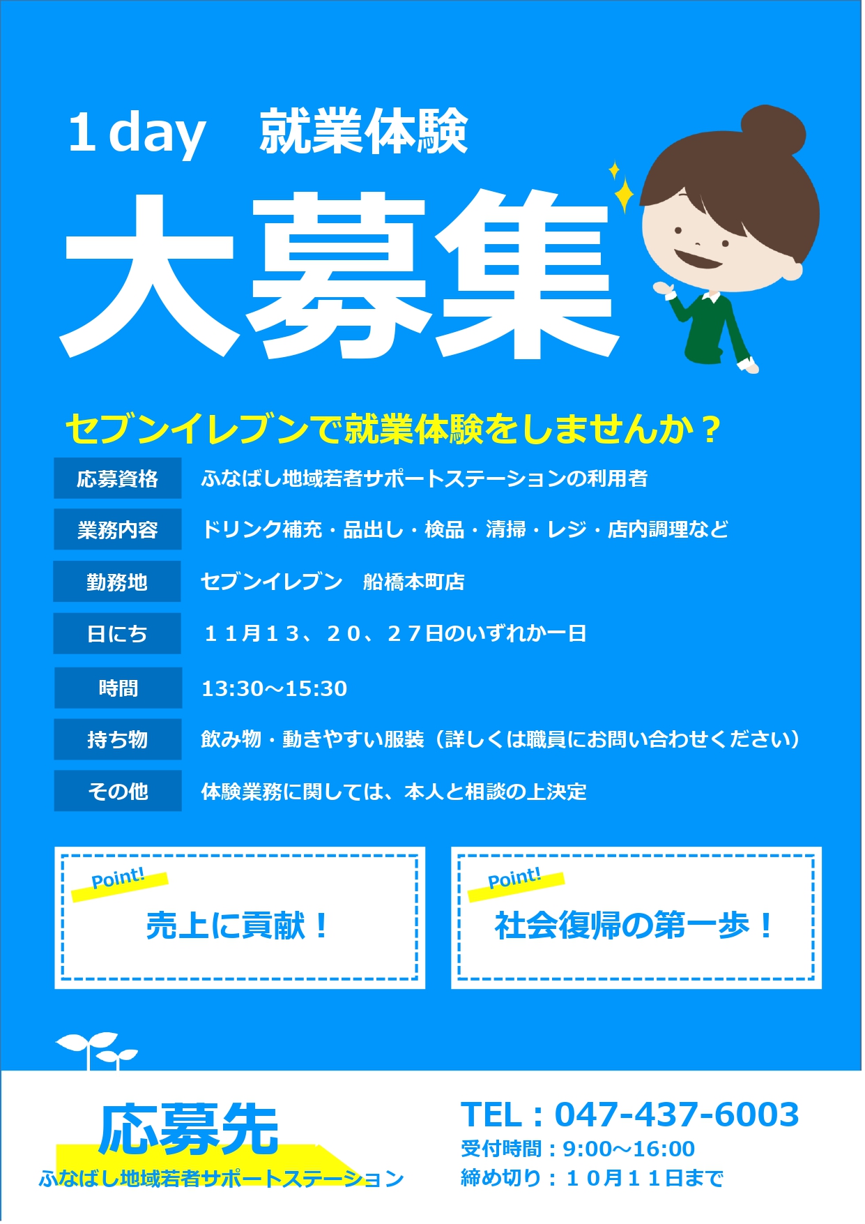 ふなばし地域若者サポートステーションをご利用のみなさん、 これから利用しようと思っているみなさん、 11月の就業準備プログラムでは、㈱ホエル様のご協力のもと、運営されているセブンイレブンの店舗で、就業体験をしてみたい方を […]