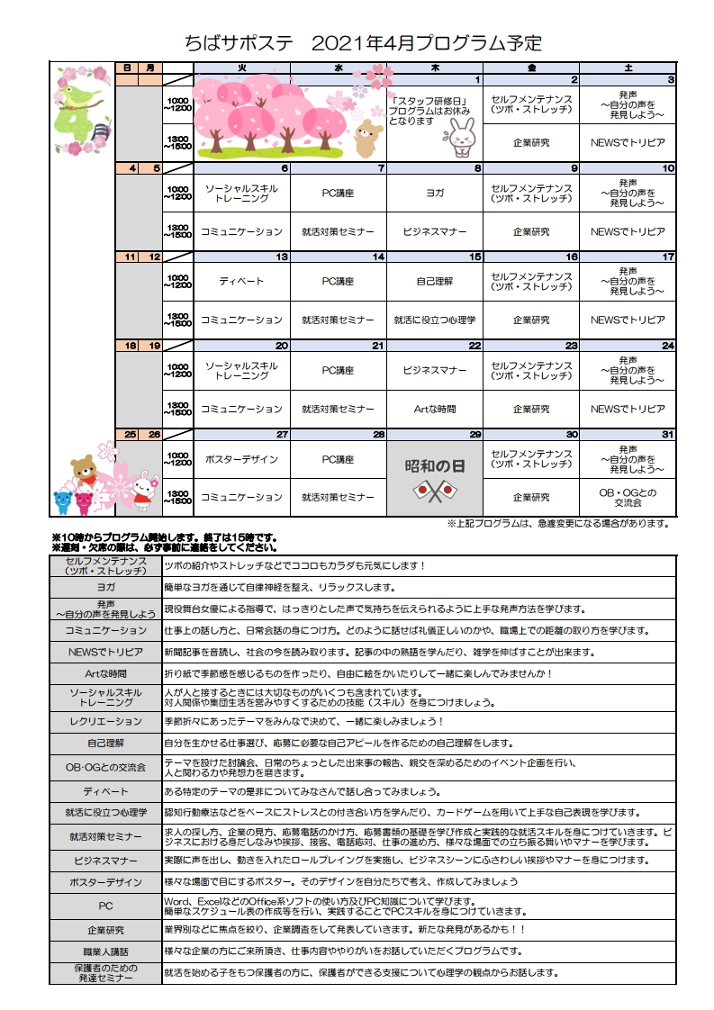 ちばサポステでは3/23(火)より、 来所での面談及びプログラムを安全策を講じた上で再開します ~~~~~~~~~~~~~~~~~~~~~~~~~~~~~~~~~~~~~~~~ 【具体的安全策】 ・予約時、利用時に健康状 […]