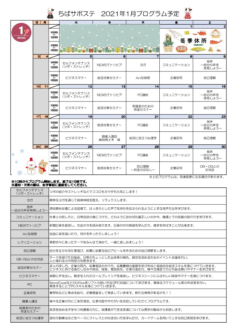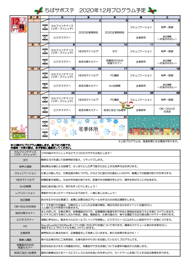 ちばサポステの今年の冬季休所は、12/27(日)から1/4(月)の予定です。 5日(火)から通常通りとなります。 休所中にいただきましたお問い合わせにつきましては、 1月5日(火)より順次ご連絡させていただきます。