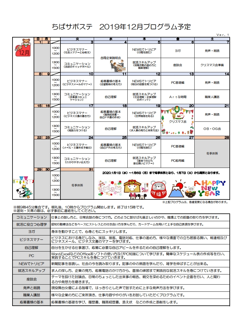 12月4日(水)に開催します合同企業説明会の参加企業様の一部変更がございますのでお知らせ致します。只今、参加申し込み受付中です!!ご希望の方はちばサポステまで電話かメールにてお問い合わせください(^^)/ 会 社 名 […]
