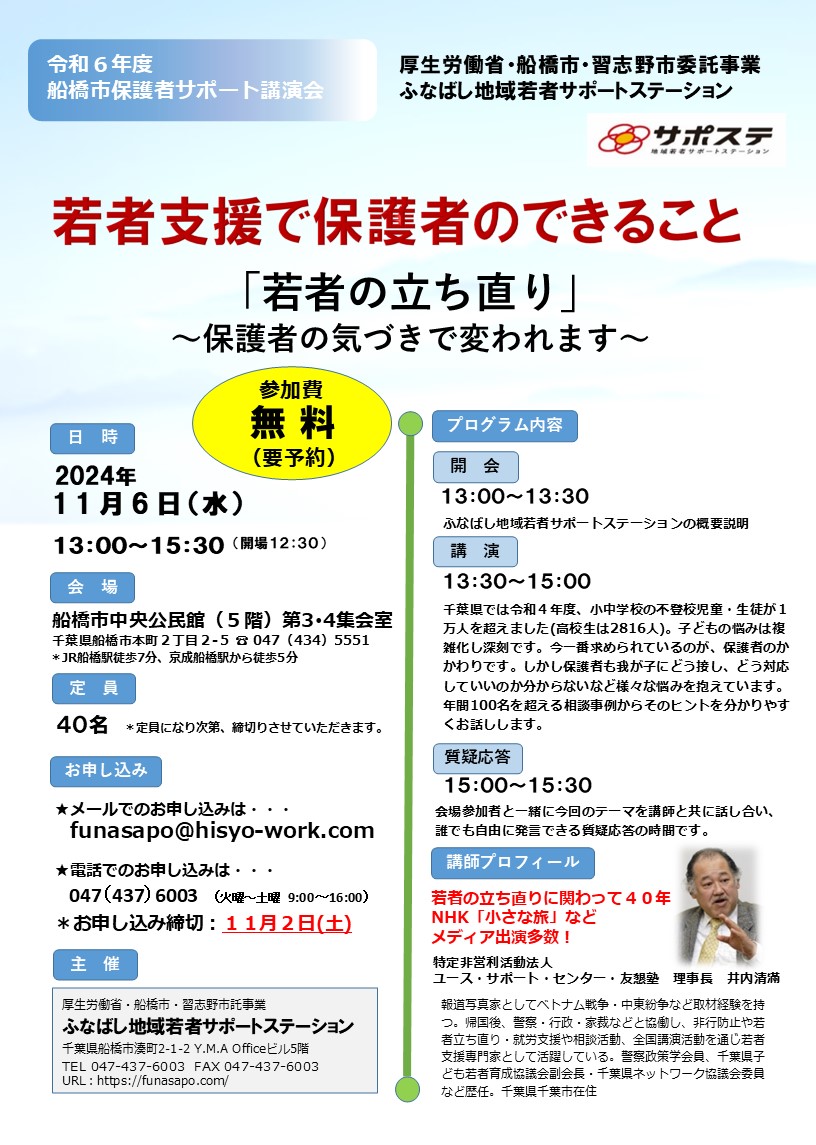 11/6(水)令和6年度「船橋市保護者サポート 講演会」のお知らせ