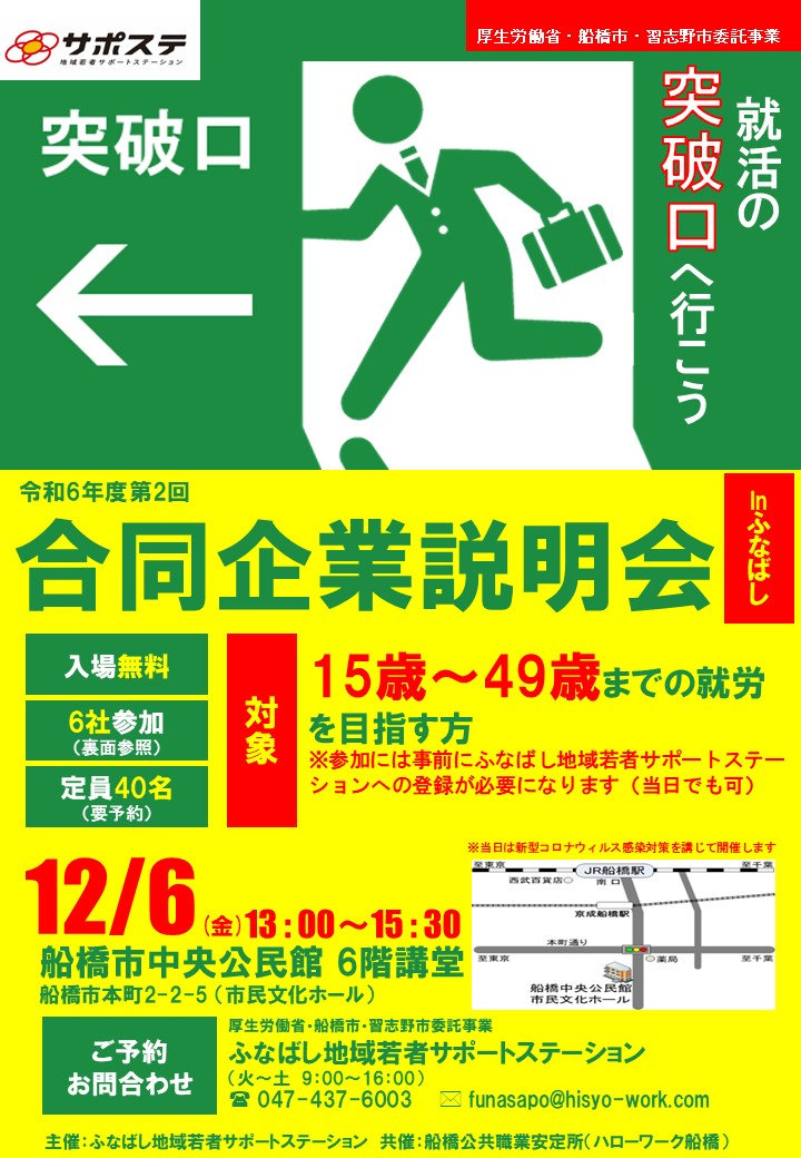 本年度2回目の合同企業説明会、開催決定! 12/6(金)13:00から船橋市中央公民館で合同企業説明会を行います。 241206合説チラシ 8月の合同企業説明会では4名の就職が決まりました。 今回は業種も職種も雇用体系も […]