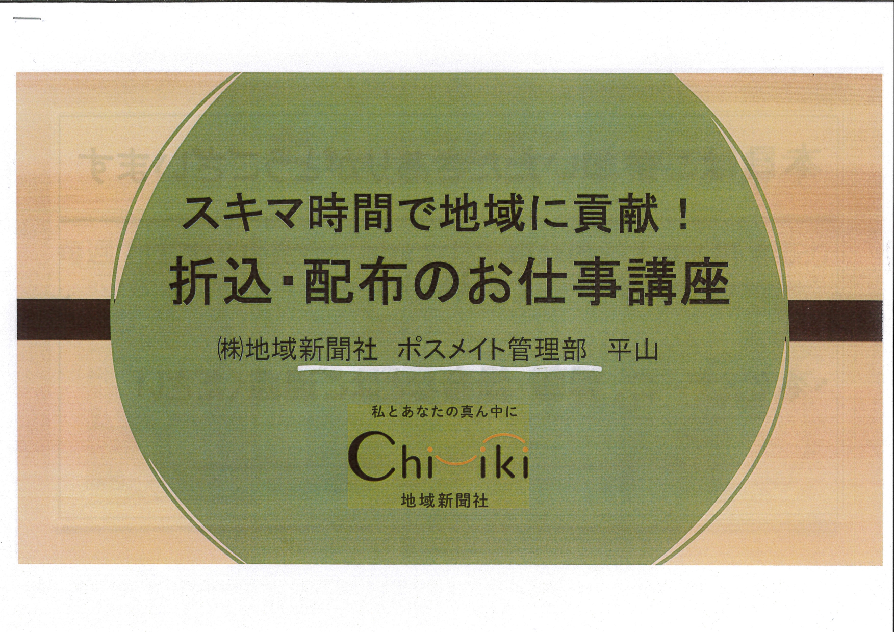 10/18(金)13:30~ 黙々作業が好きな方はもちろん、そうでない方も注目! 地域の人と人をつなぐ「ちいき新聞」のポスティング業務案内&折込体験会です! お気軽にご参加ください! 体験会_地域新聞社