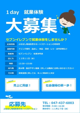 ふなばし地域若者サポートステーションをご利用のみなさん、 これから利用しようと思っているみなさん、 12月11日(水)の就業準備プログラムでは、㈱ホエル様のご協力のもと、運営されているセブンイレブンの店舗で […]