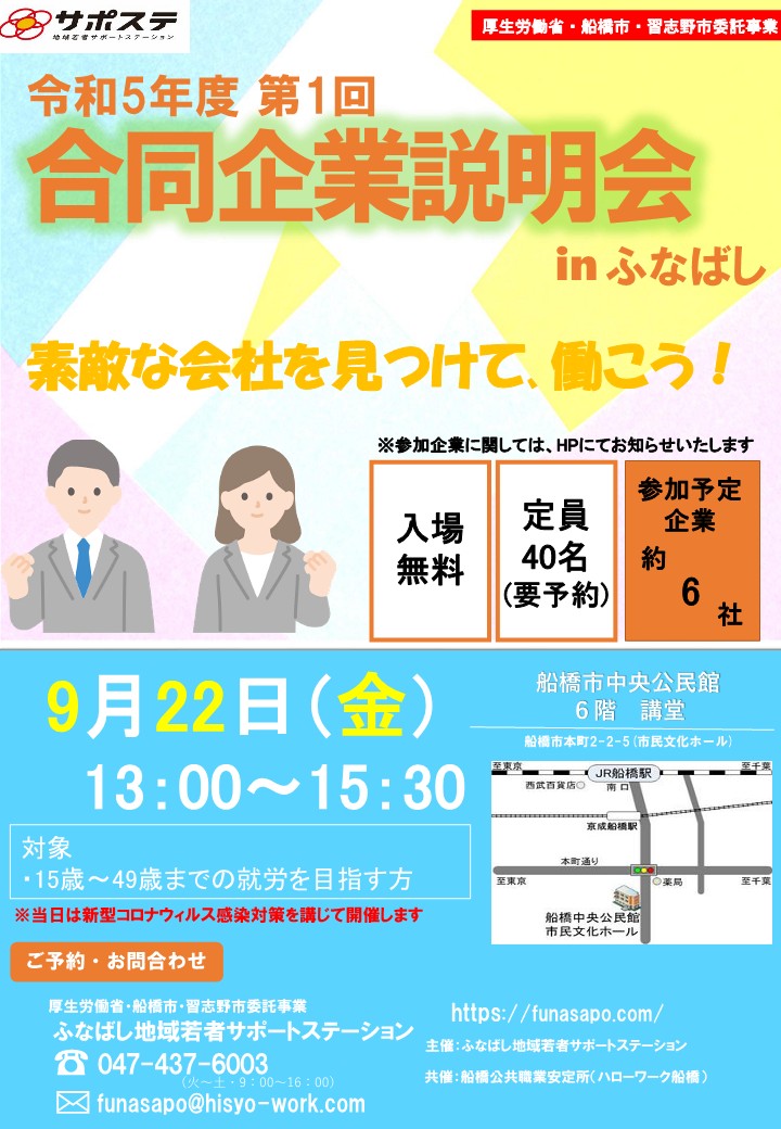 9/22(金)「合同企業説明会」の参加企業が決まりました。 まだふなサポを利用したことがない方でも登録の上参加は可能です。 また、すでに利用されてる方、参加は必須です。 例年「合同企業説明会」をきっかけに就職が決まってい […]