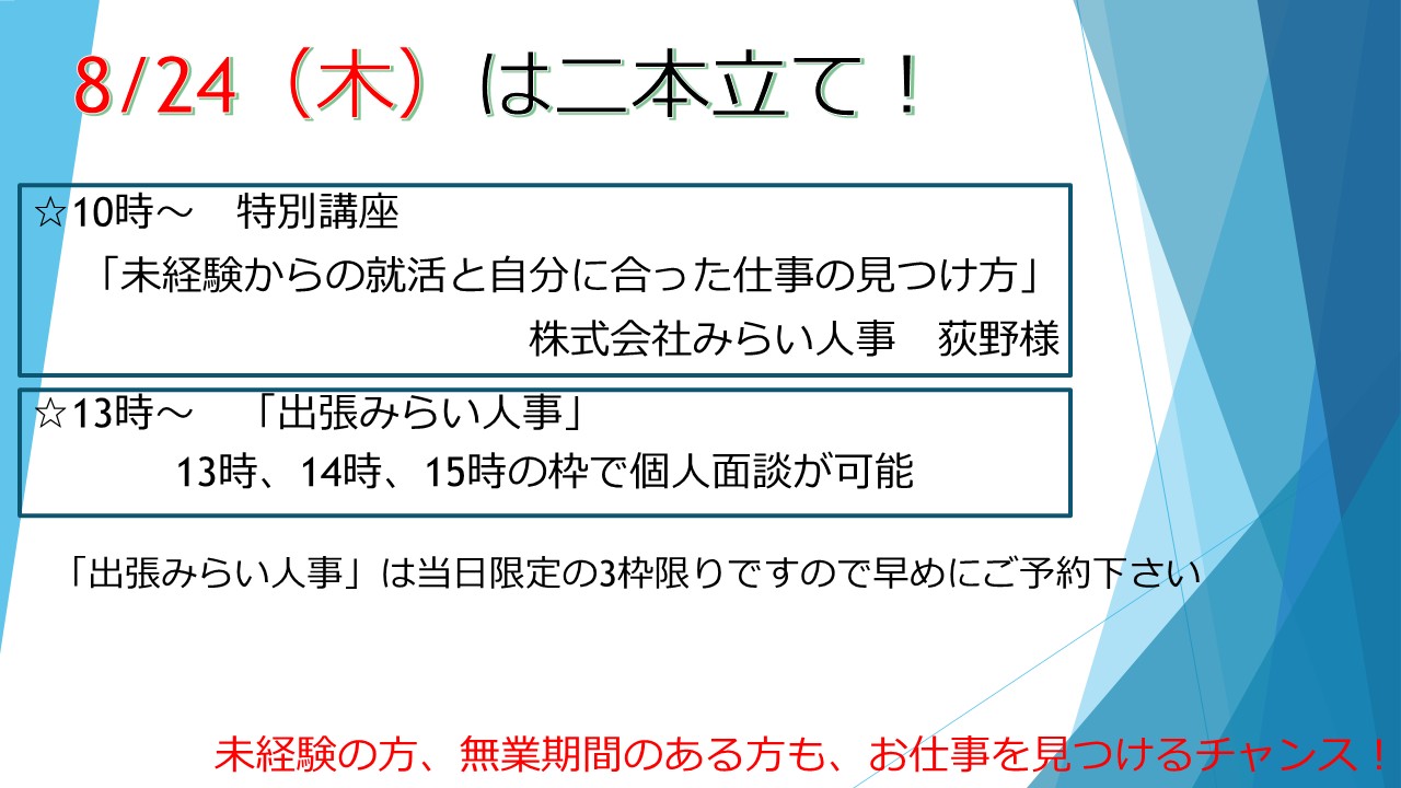 8/24(木)特別講座「未経験からの就活と自分に合った仕事の見つけ方」と 「出張みらい人事」開催!