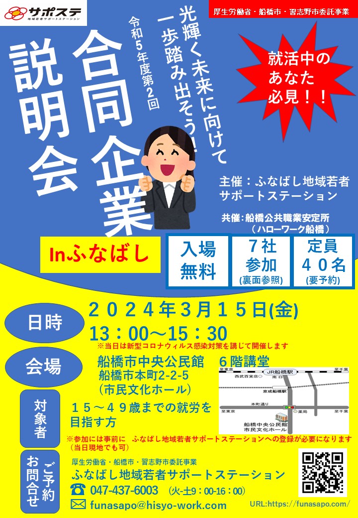 本年度1回目の合同企業説明会、開催決定! 8/1(木)13:00から船橋市中央公民館で合同企業説明会を行います。 ☆R6年度1回合説チラシ 事前に登録していただければ(当日でも可)、 まだふなサポを利用して […]