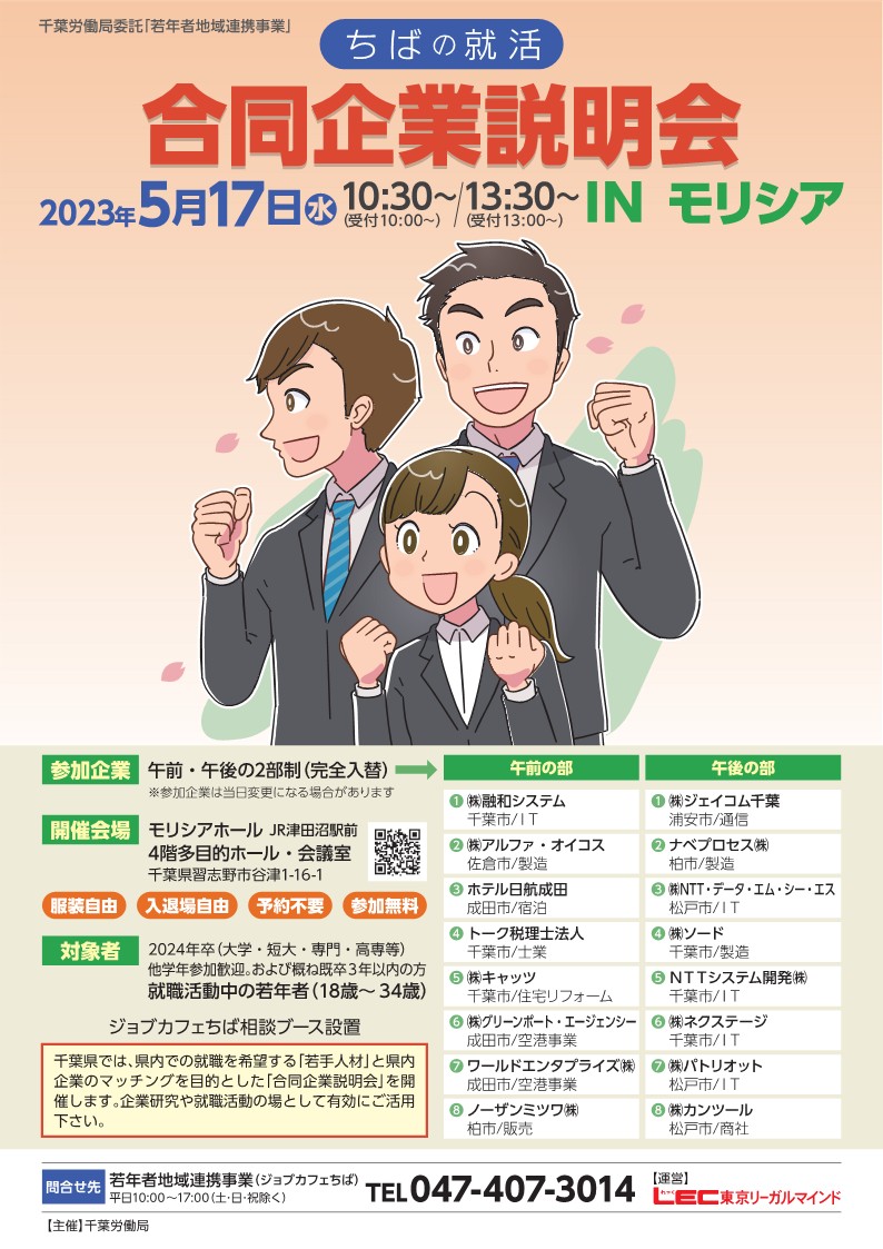 参加者まだまだ募集中です(^^♪ ちば地域若者サポートステーションでは12/8(木)合同企業説明会を八千代市総合生涯学習プラザにて開催いたします。 採用担当者と直接お話しできる絶好のチャンスです。 ぜひこの機会にお仕事内 […]