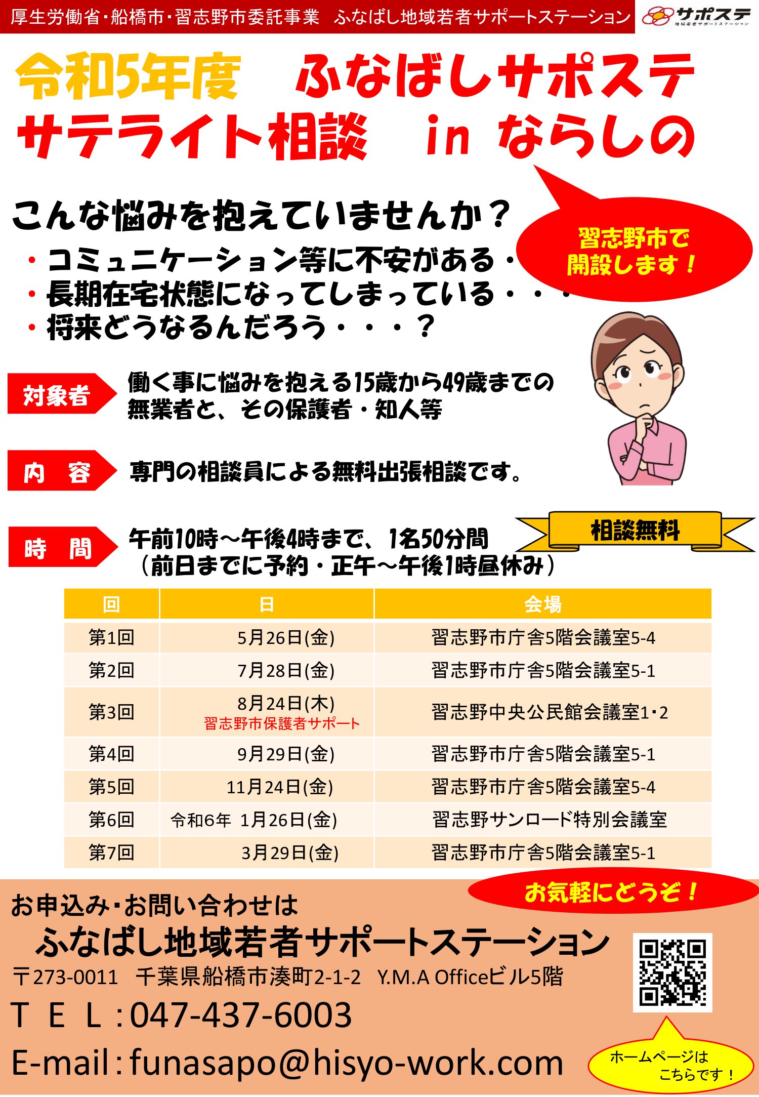 令和5年度ふなばしサポステ サテライト相談inならしの 対象者:働くことに悩みを抱える15歳から49歳までの無業者と、その保護者・知人等 内容:専門の相談員による無料出張相談です。 時間午前10時~午後4時まで、1名50 […]