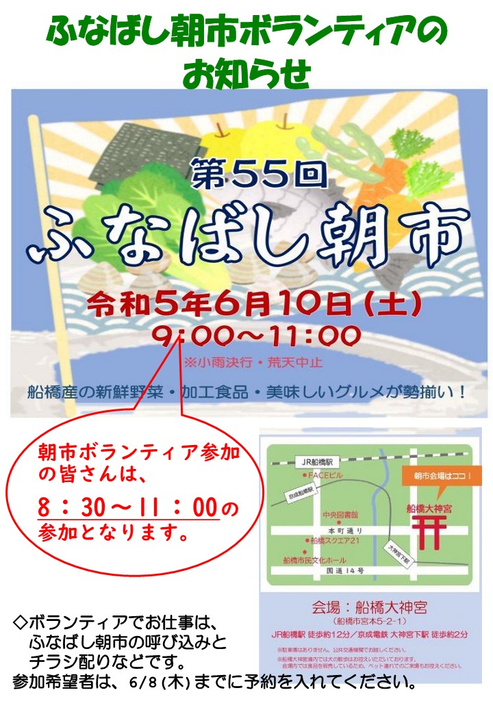 「ふなばし朝市」のボランティアに参加しませんか?