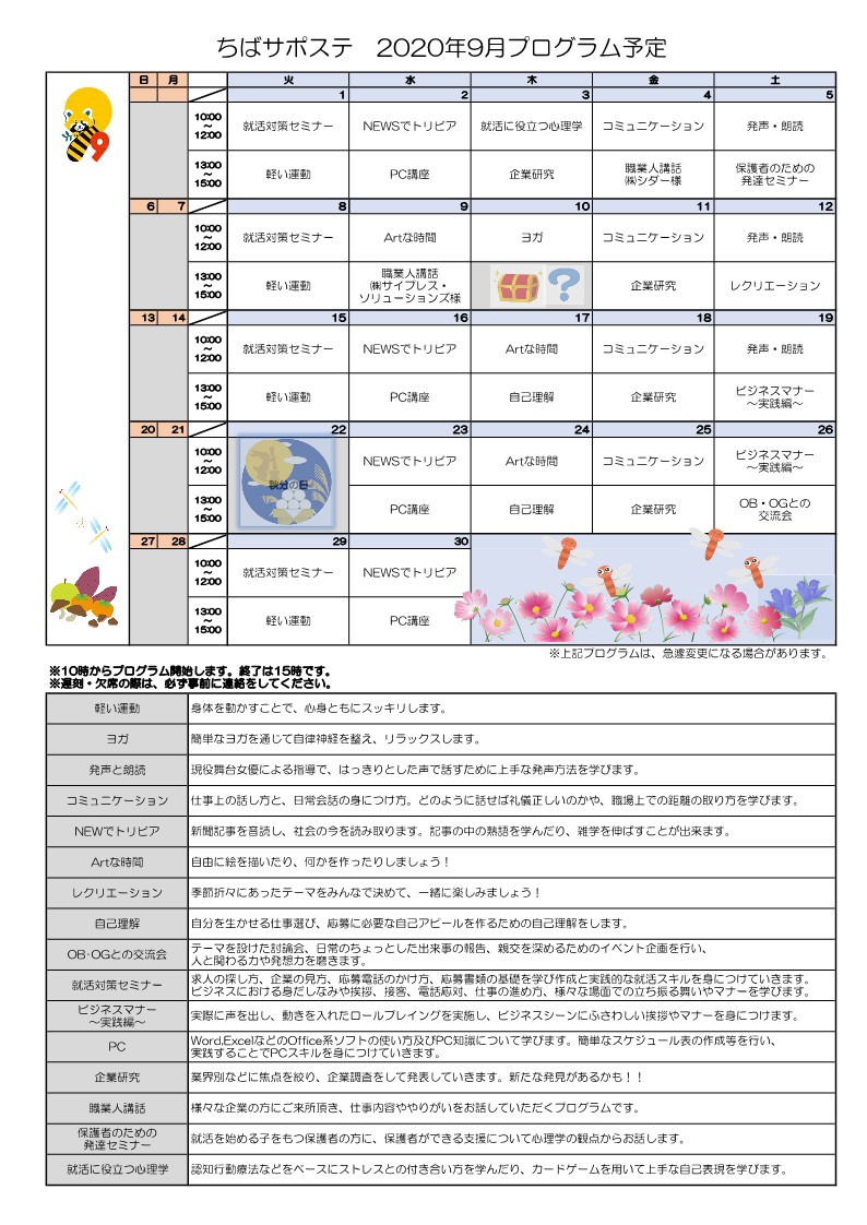 ちばサポステでは6月23日(火)より、 来所でのプログラムを安全策を講じた上で再開します 【具体的安全策】 ・予約時、利用時に健康状態(症状の有無・体温等)を確認する ・アルコール除菌、マスク着用を徹底する ・「3つの密 […]