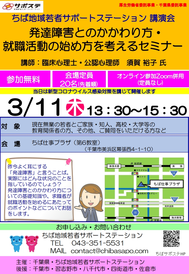 昨今よく耳にする「発達障害」ということば。 実際には、どんな状況のことを指しているのでしょう? ちば地域若者サポートステーションの臨床心理士が、 発達障害とのかかわり方についての基礎知識や、心理学の観点からお話をします。 […]
