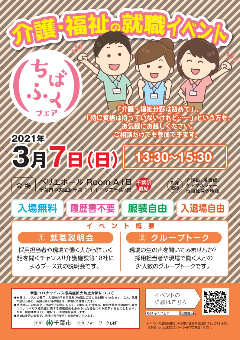【就活情報】「3/7(日)介護・福祉の就職イベント」「3/10(水)・3/11(木)千葉県合同企業説明会(オンライン)」