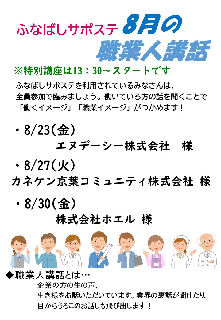 ふなばしサポステの『職業人講話』は毎回企業様にご来所いただき、 「企業の方の生の声」「生き様」をお話ししていただいております。 業界の現状はもちろんですが、 「家からめっちゃ近いし、とりあえず行ってみよう!」と思ったのが […]