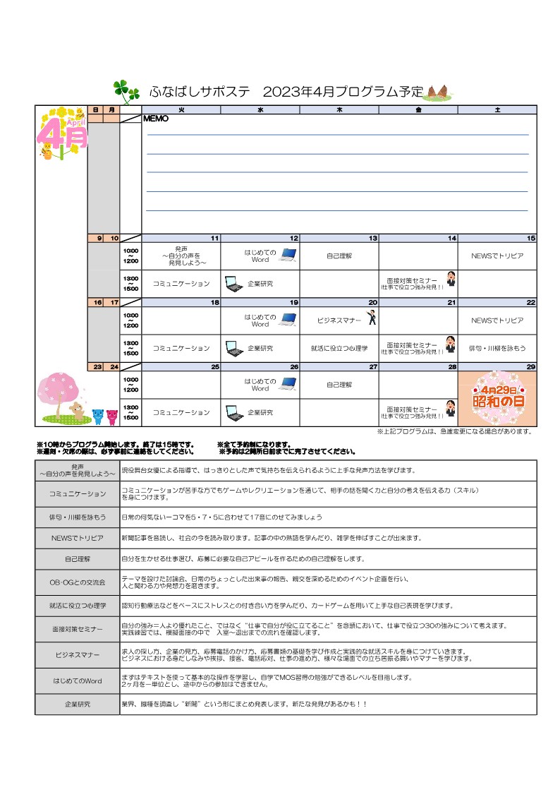 新年度が始まりました。 計画をしっかりと立てて、プログラムにどんどん参加していきましょう! ※プログラム参加には事前予約が必要となり予約は2開所日前までに完了させてください。 サポステのプログラムちょっと気 […]