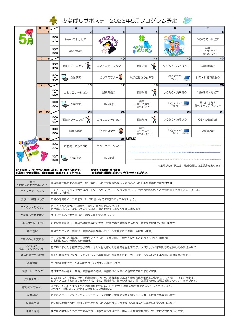 5月のプログラムが決まりました! 5月は新しいプログラムが多いので、ぜひ予約の上参加してみてください。 2023年5月度プログラム