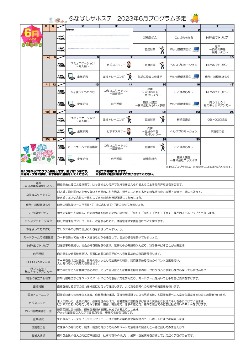 6月のプログラムが決まりました。 今月も新しいプログラムが始まります! しっかりと計画を立ててどんどん参加していきましょう!! 2023年6月度プログラム