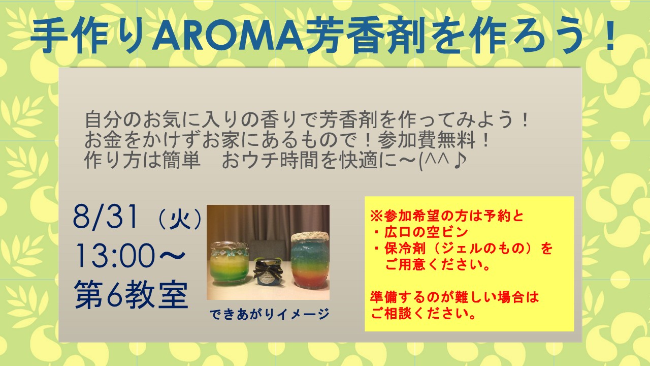 8/31(火)13:00~アロマワークショップ~夏休みの工作~ 先日のstaffコラムで紹介しました「アロマ消臭剤」の反響が大きかったので アロマのワークショップを行うことになりました~。 好きな香り、好きな色使いで夏気 […]