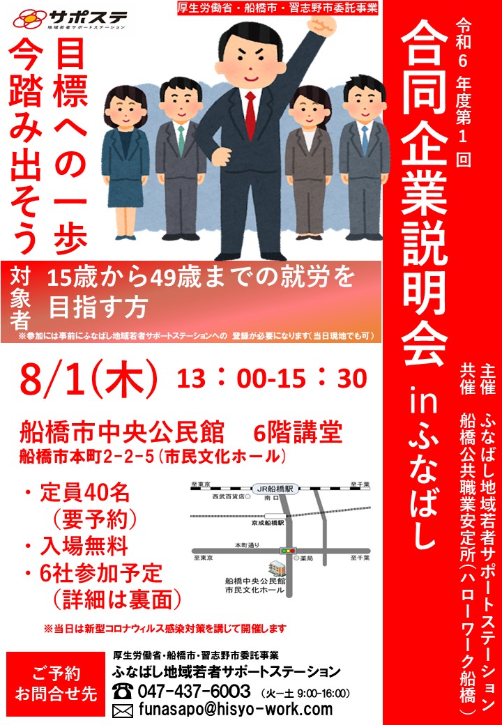 ふなばし地域若者サポートステーション主催、ハローワーク船橋共催で年2回行われる就職イベントです。 第1回は、8月1日(木)13時から行われます。 対象者は、15歳~49歳までの就労を目指している方です。参加 […]