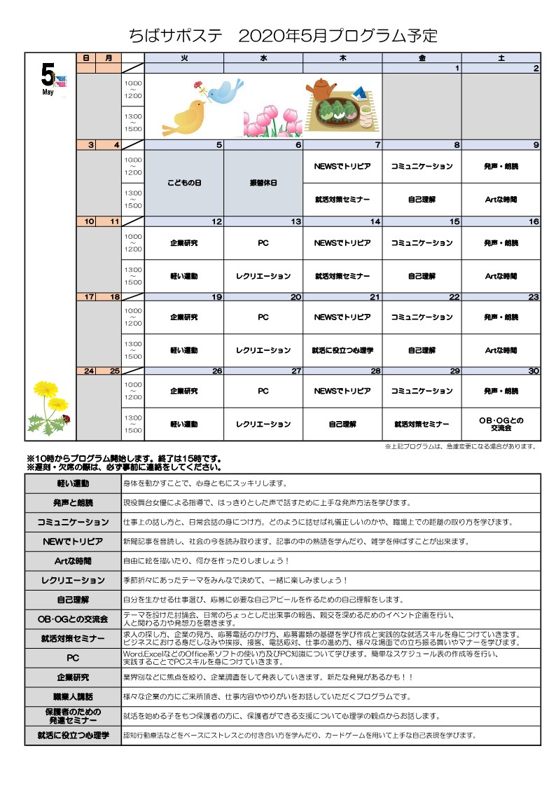 5月のプログラムが決まりました! プログラムだけでも参加したいという方、まずはご連絡下さいね♪ スタッフも手洗い、うがい、消毒を徹底し感染症対策を行っています。 不要不急の外出を避け新型コロナウィルスに感染しないようにし […]