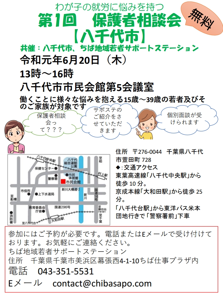 みなさん、こんにちは!ちばサポステです(^^)/ 八千代市市民会館で開催します保護者相談会の日程が決定いたしました! 日時 令和元年6月20日(木) 時間 13:00~16:00 場所 八千代市市民会館 第5会議室 働く […]