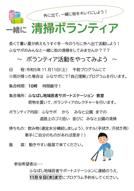 11月ももう終わりですが暑い日寒い日が繰り返していますね。 皆さまいかがお過ごしでしょうか。ご報告が遅れましたが11月11日午前プログラムでは「自己理解」の時間に、ふなサポ建物のある道路沿いを清掃する活動を行いました! […]